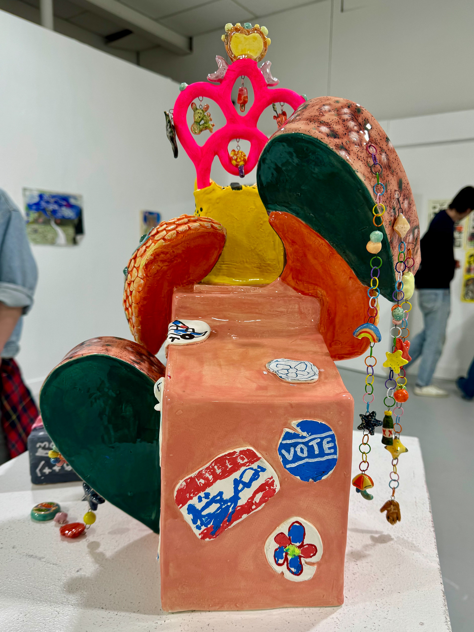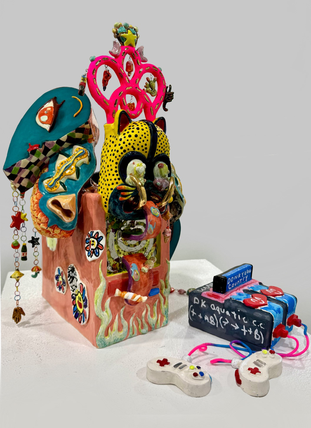 Collaboration with Julio Alejandro. Stoneware clay, glaze, underglaze, luster, metal, nylon rope, acrylic paint and pastels. 19" x 15" x 15" inches.