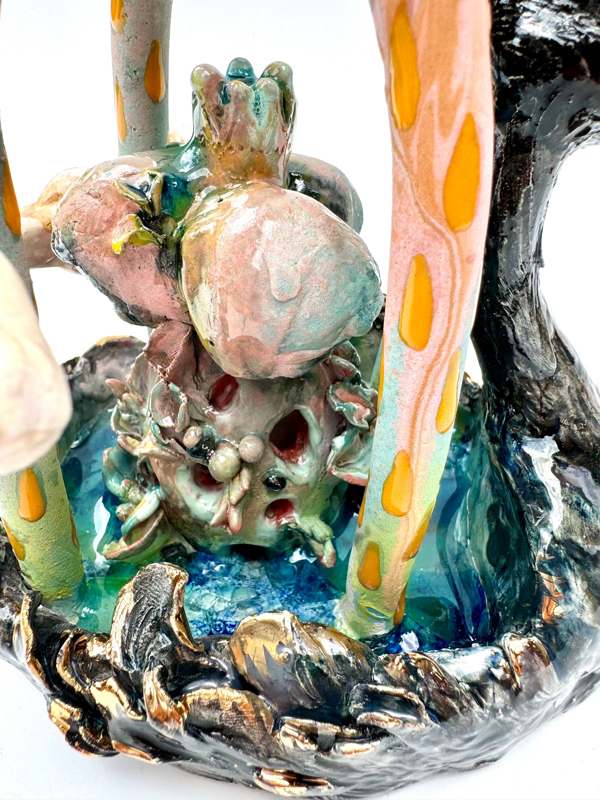 Stoneware clay, Glaze, Underglaze, Glass, Luster. 8 x 5.25 x 7 inches